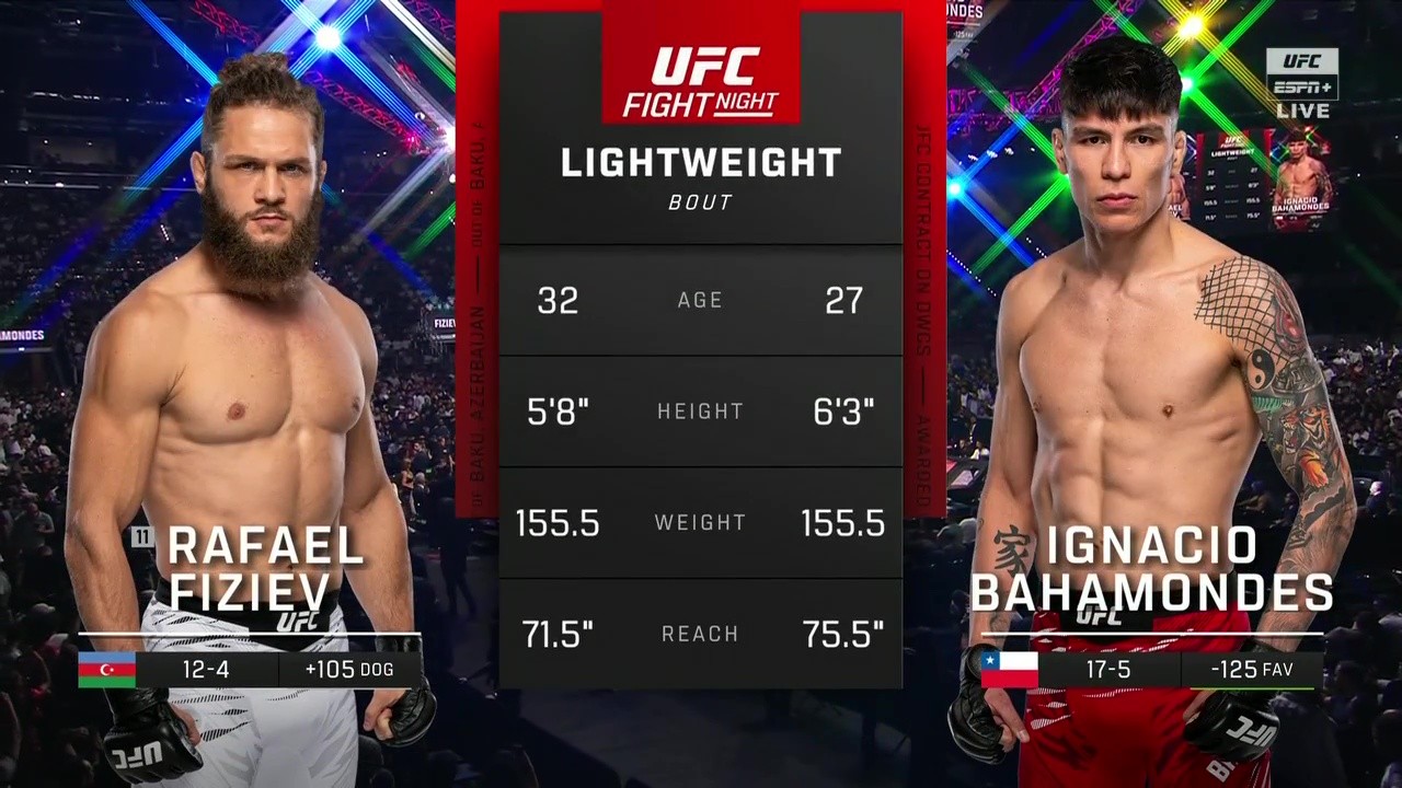 Рафаэль Физиев, представляющий Казахстан, имеет в своем послужном списке 12 побед и 4 поражения. Его последнее выступление завершилось поражением единогласным решением судей от Джастина Гейджи. Игнасио Бахамондес подходит к бою с рекордом 17-5, одержав в своем последнем поединке победу сабмишеном над Джейлином Тернером. Список их предыдущих соперников говорит об уровне бойцов; Физиев постоянно сталкивается с опытными оппонентами, такими как Гейджи, в то время как Бахамондес находится на подъеме после своей победы, которая была особенно примечательна, учитывая преимущество Тернера в росте.